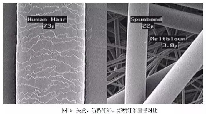 為了更能說明問題,我們將紡粘層S纖維,熔噴層M纖維和頭發(fā)做一個對比圖如下,頭發(fā)直徑的1/3,接近紡粘層纖維,而頭發(fā)直徑的1/30,和熔噴層M纖維直徑接近了,當(dāng)然,研發(fā)人員還在開發(fā)更細(xì)的纖維,來保證更好的抗菌阻隔性。